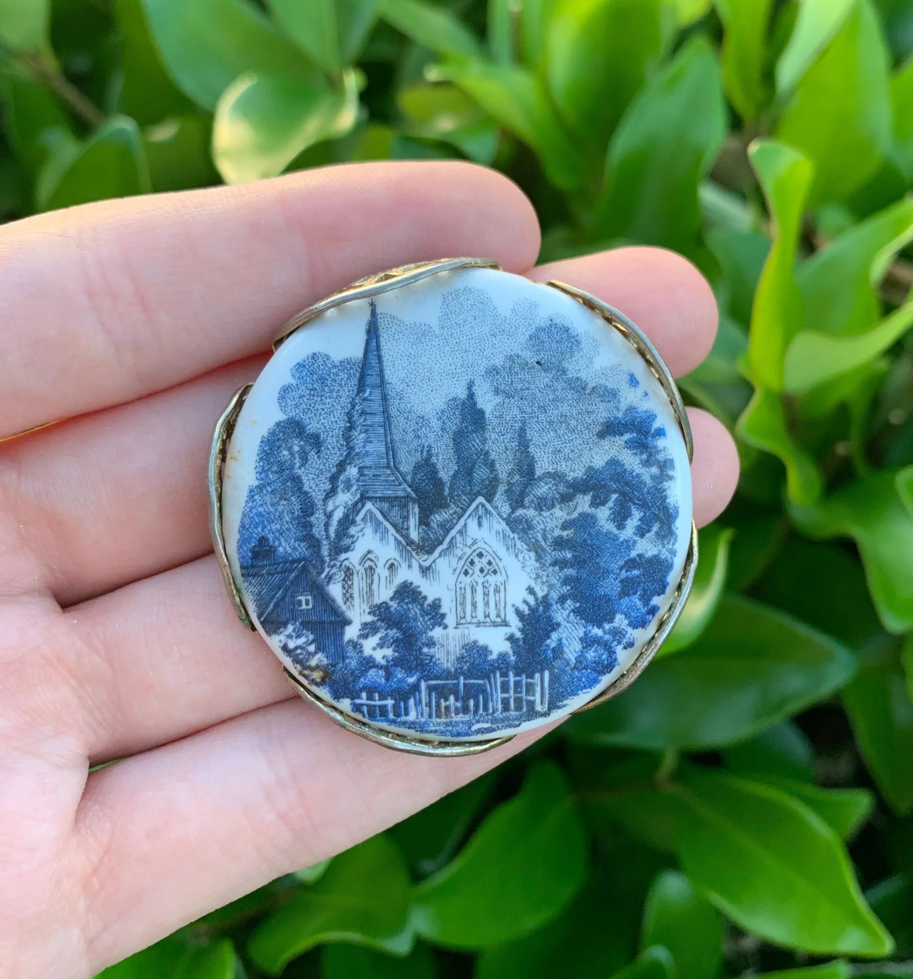 Great condition. No major flaws or scratches. Small ones possible. Couple small marks around edges that may clean up. Gold tone metal that the medallion is set in. Rattle around slightly but won’t fall out. Porcelain-like material. I’m not 100% certain that it is porcelain but feels like it. Blue vintage church design. Unsigned so brand is unknown. Not certain what year it is from. Color may vary slightly from photos due to lighting. See photos for approximate measurements NO TRADES/RETURNS