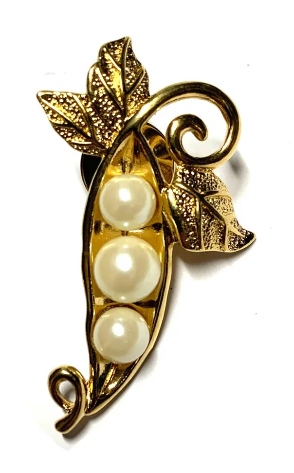 Charming vintage-inspired brooch featuring a whimsical gold-tone pea pod with three luminous faux pe... Show more