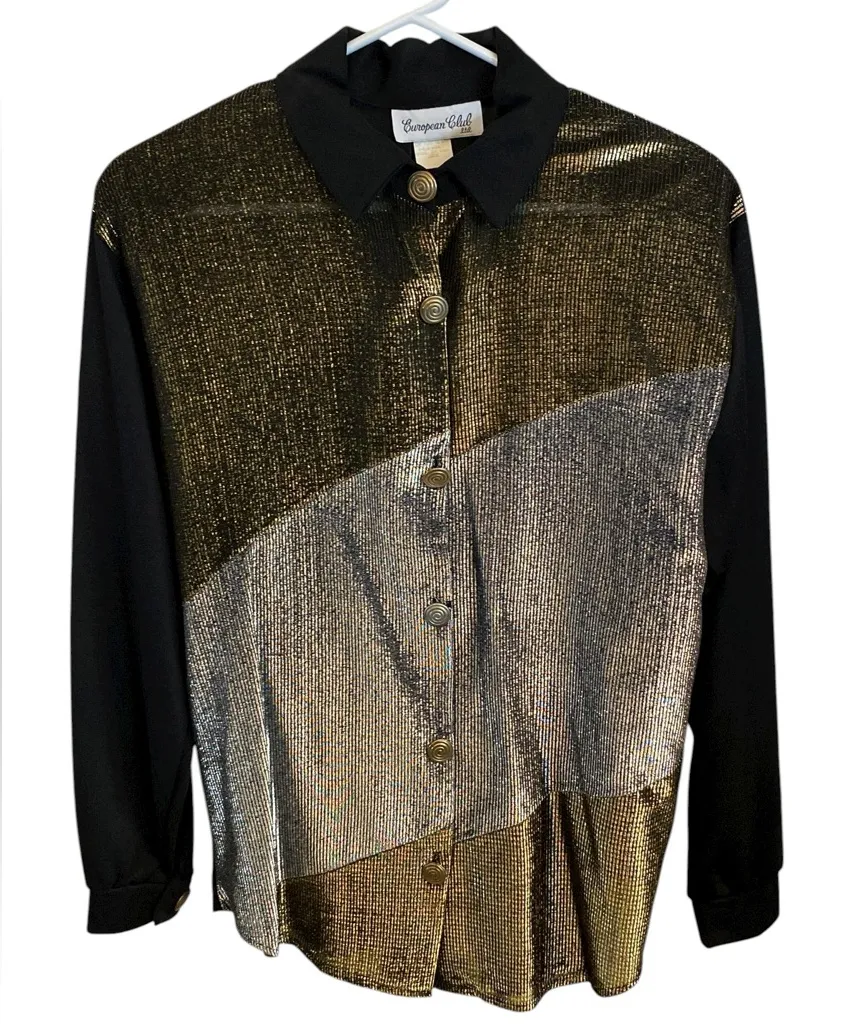 Made by European Club Stylish button-up shirt with gold and silver panels. Features a classic collar and long sleeves w/ statement buttons . made in USA b3.5111125 20.5” pit to pit 42” waist 28 “ long Disco Cowgirl , 70s disco , 80s party shirt , New Year’s eve shirt , club wear