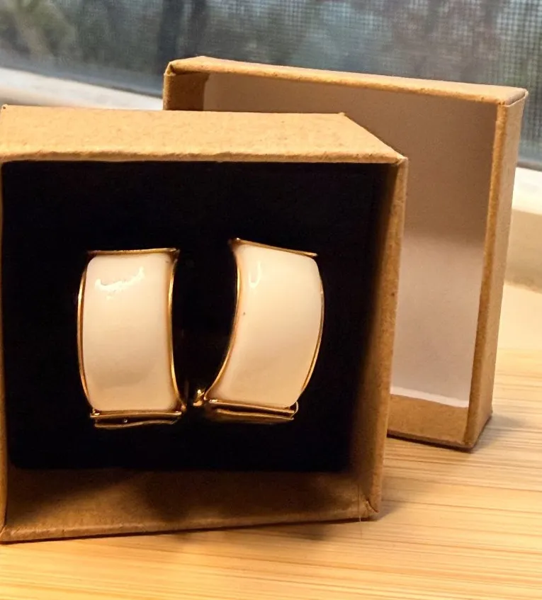 These professionally crafted vintage clip-on earrings feature a chic white enamel inlay with a gold-tone finish, offering timeless elegance and durability. • Clip-on style for non-pierced ears • White enamel inlay with gold-tone finish • Includes a protective gift box • Diameter: Approximately 1 inch Minimal wear on metal surface, no visible chips or cracks on enamel. Measurements: Diameter = 1 inch.