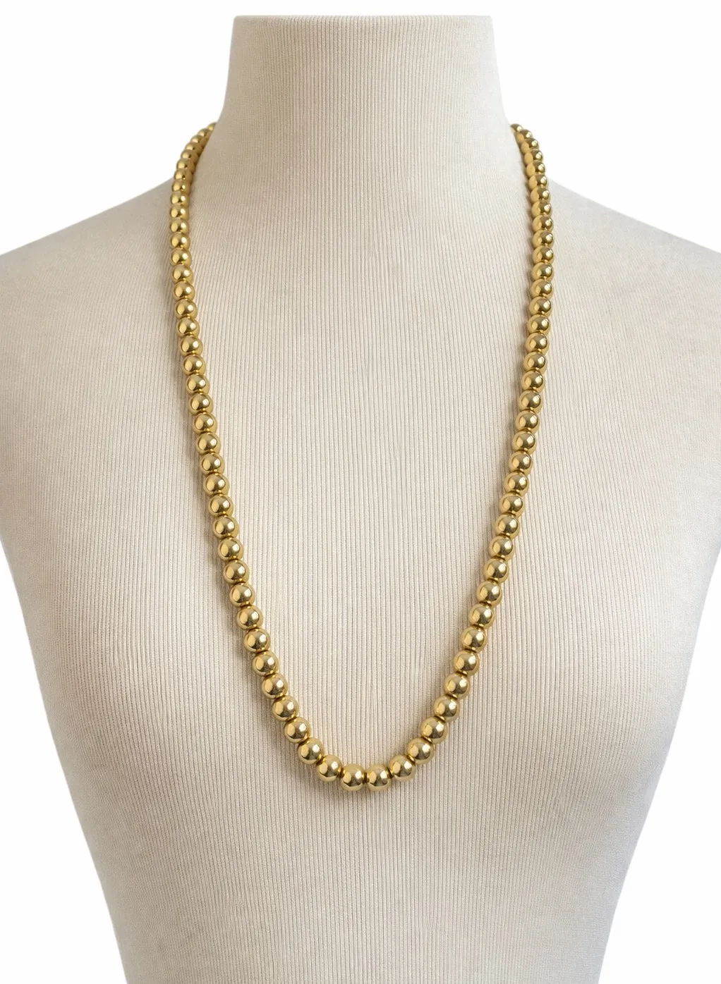 This matinee length necklace drapes at mid chest and looks elegant worn alone or layered with other necklaces. Metal: Gold tone costume jewelry, not solid gold Beads: Polished round metallic beads, uniform size Marked: Korea on clasp Length: Approximately 24 to 26 inches Clasp: Spring ring Era: 1970s to 1980s Condition: Excellent vintage condition with light surface wear consistent with age, bright finish, secure clasp Excellent vintage condition with light surface wear consistent with age, bright finish, secure clasp