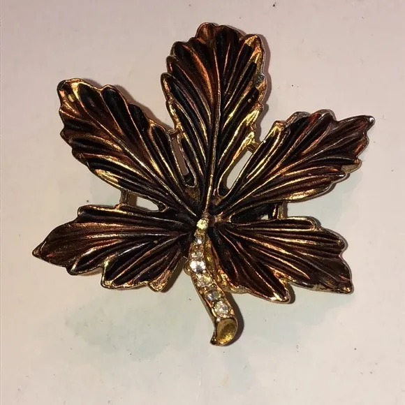 Vintage Gold Tone Black & Brown Enamel CZ Rhinestone Leaf Brooch Shoulder Pin - $18 - From Vault
