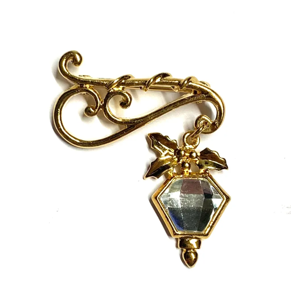 Add holiday charm to your outfit with this festive vintage brooch featuring a dangling faceted ornament framed in gold-tone metal with a holly leaf and berry detail. The ornate swirl design adds elegance, making it perfect for a blouse, coat, or scarf. Secure pin back ensures easy wear. Excellent vintage condition with minimal wear. 1.25 wide x 2” tall