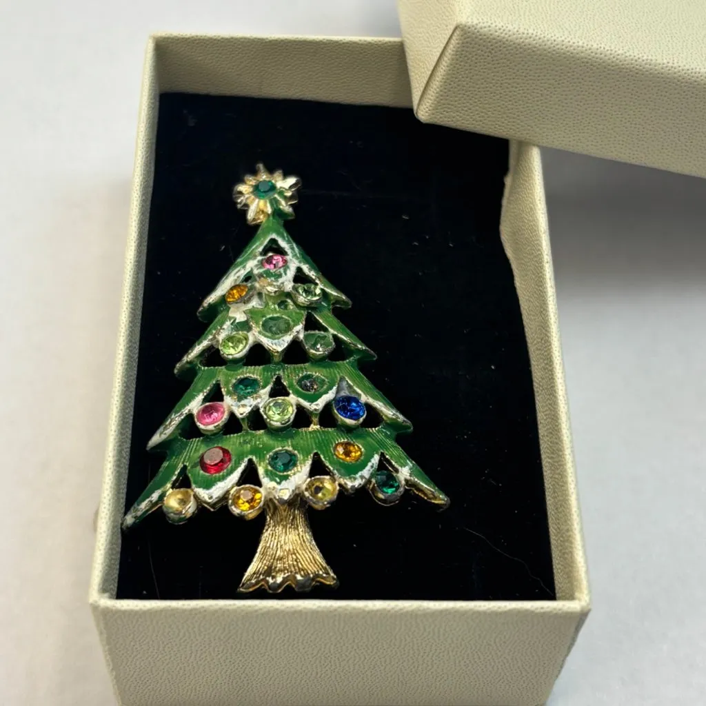 This brooch, a delightful vintage treasure, embodies the festive spirit of the holiday season. Its gold-tone Christmas tree design sparkles with vibrant jewel accents and an intricate star topper, exuding timeless charm and joyful elegance. A true statement piece for those who adore unique and nostalgic accessories. • Gold-tone metal construction for durability • Colorful jewel accents enhance holiday sparkle • Secure pin closure on the back • Intricate detailing with a star topper design Like new condition, no visible flaws. Brooch measures approximately 2.5 inches tall and 1.5 inches wide. Features: • Winter • Festive Condition: Pre-Owned Like New