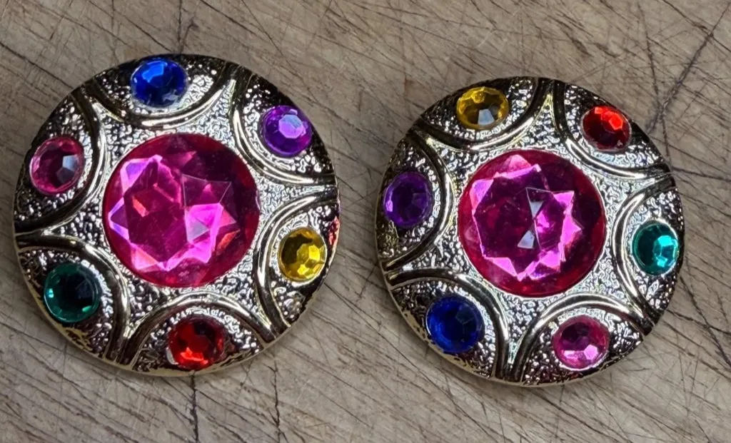 These elegant clip-on earrings feature a dazzling pink center rhinestone surrounded by vibrant multicolor accents on a gold-tone base, offering timeless style. • Clip-on fastening for non-pierced ears • Gold-tone base with intricate detailing • Includes original black box • Diameter = 1 inch Pre-owned with slight adhesive residue on the back; front rhinestones and gold-tone base in very good condition. Diameter = 1 inch.