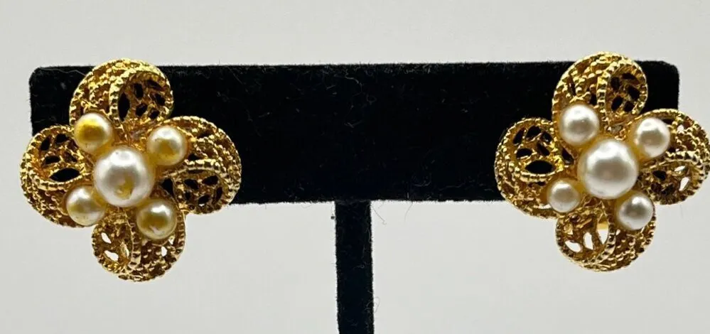 Vintage Gold Tone Faux Pearl Filigree Floral Statement Earrings Clip On Glam See photos for approximate measurements Preowned/gently used-Some finish on faux pearl coming off Ships fast Ships from a smoke free pet friendly home