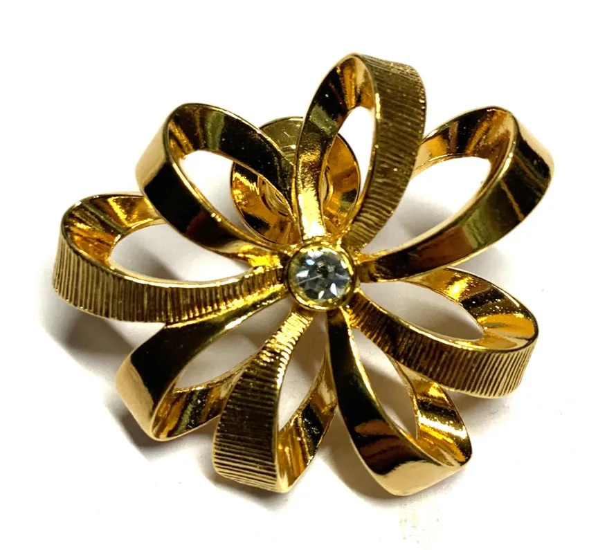 Vintage Gold Spiral Brooch with Rhinestones – Classic Circular Pin Add a touch of vintage elegance with this stunning gold-tone flower brooch, featuring textured ribbon-style loops and a sparkling rhinestone at the center. The dimensional floral design offers timeless charm, ideal for jackets, blouses, hats, or bags. The brooch uses a secure clutch-back pin fastening (military or tack-style), making it easy to wear without damaging delicate fabrics. A perfect collectible piece for vintage jewelry lovers or a unique gift idea. Excellent vintage condition. 1.5” wide x 1.25” tall