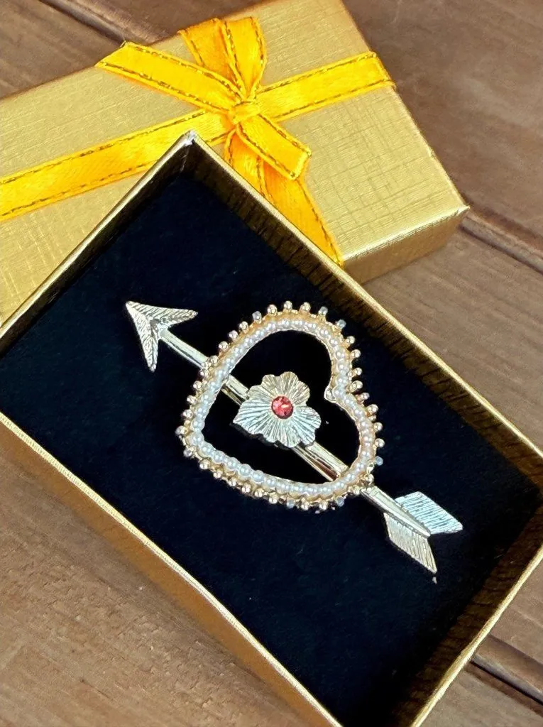 This vintage brooch combines elegance and charm with its gold-tone finish, pearl accents, and red crystal centerpiece, perfect for adding sophistication to attire. • Features a heart shape with arrow design • Embellished with faux pearls and red crystal • Includes a secure pin back • Measures approximately 2 inches wide Pre-owned, good condition, minor wear visible upon close inspection. Measurements: Width = 2 inches.