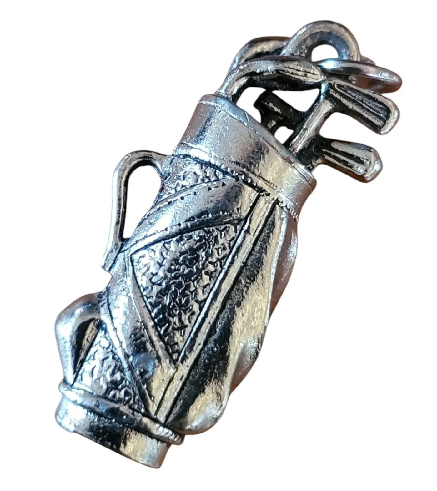 Add some vintage flair to your jewelry collection with this unique 3D heavy pendant bracelet charm. The charm features a golf club bag design with a silver color and is perfect for any sports enthusiast. The charm is vintage and adds a touch of nostalgia to your accessory collection. It is also handmade and has no stone for a simple and elegant look. The charm is signed and has no antique features. Ideal for any occasion, this charm is a must-have for any fashion-conscious individual.