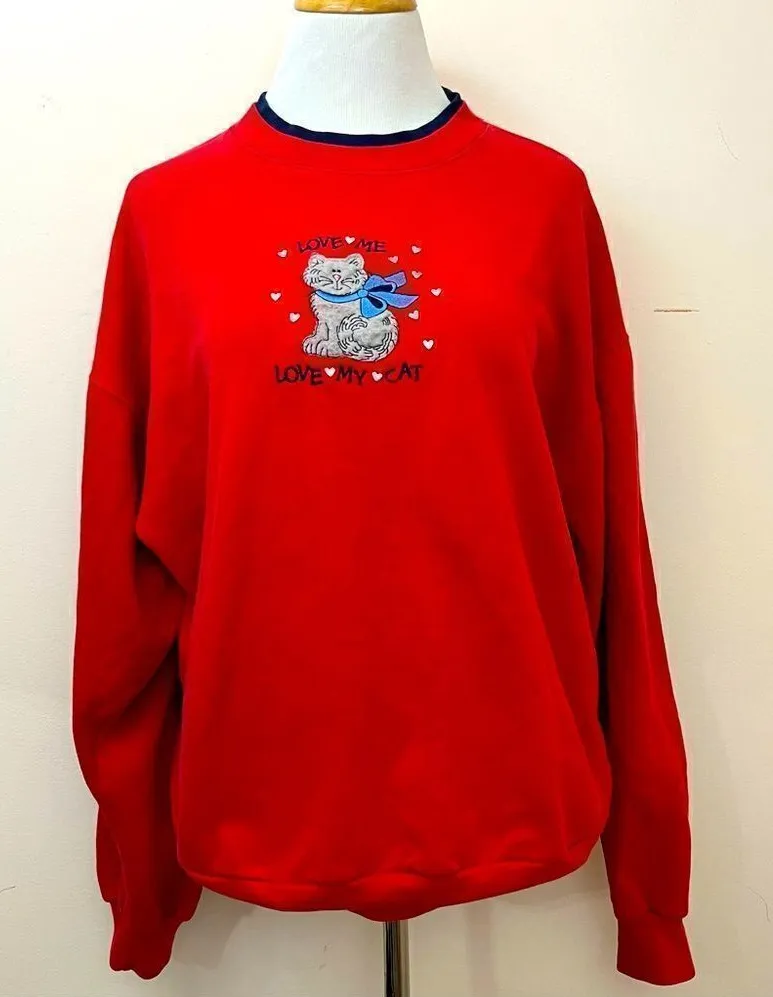 Quirky cat lover sweatshirt from M & C Sportswear Mock neck Very soft cotton blend Cute little kitty appliqué Very good overall condition Tag is faded but fits like L/XL Please see photos for measurements to ensure proper fit Cozy Quirky CatLover CatLady GrannyCore Vintage 90’s