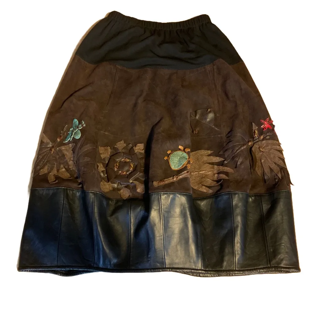 This listing is for the skirt pictured only. GROWNBEANS Karen Groner -vintage -pockets at front -black genuine leather and brown suede with teal leather accents -fabric panel waist elastic and stretchy -approximately knee length depending on the individual -ballon style where it is slightly smaller around at bottom -floral leather appliques -artisan hand crafted -made in USA The skirt is marked size large (26-40 inch waist) -please use measurements provided in photos for fit determination; Size tags alone, are not a reliable source. Item is free of stains or holes. Preowned items (especially vintage pieces) are subject to any minor imperfections which come with an article of clothing that has been washed and worn; these signs of wear generally include light pilling or fuzzing, loose threading or wrinkling. Some listings may not include these issues, but as a general disclaimer, please be aware it is possible. Unless indicated, there is no major damage to a piece. To mitigate the cost of the items and avoid any issues customers may have with allergies, we leave desired cleaning to the new owners.