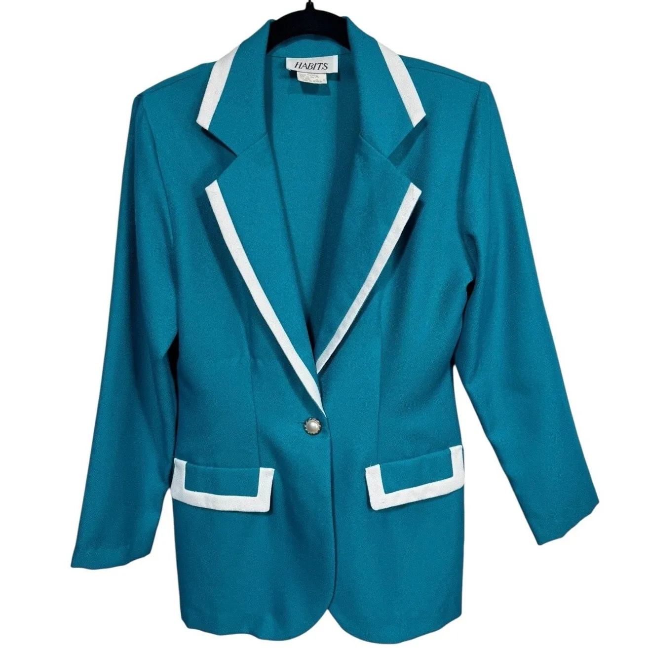 Description: Vintage Habits teal green blazer with white contrast trim and bold mod styling. Features a single decorative gold-tone button closure, faux flap pockets, and padded shoulders for a structured silhouette. Made in the USA from 100% polyester. Tag has no size, please see measurements. Likely fits Small to Medium. Length: 29" Chest: 16.5" (flat) In good used condition