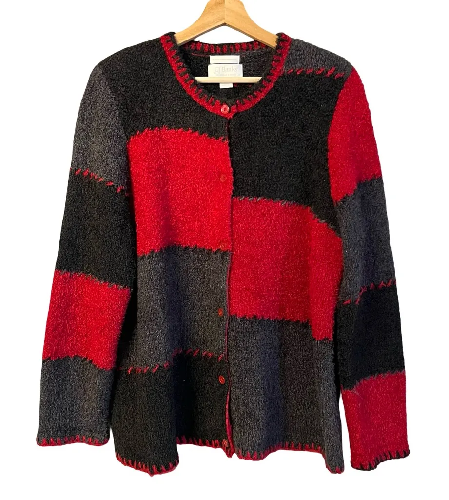 Vintage CJ Banks For Christopher Bans Hand Embroidered Patchwork Mohair Blend Cardigan Grandma Cozy -Size 1X -Excellent Preowned Condition: No holes, stains or tears -See photos for measurements -Button down closure grandmacore, vintage, holiday, cozy, 90s, grunge, artsy, cottagecore, cabincore