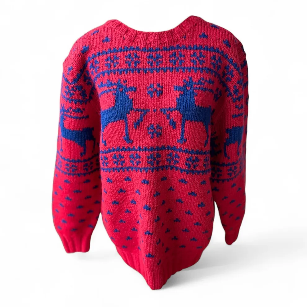 Vintage 90s Ralph Lauren Hand Knit 100% wool red and cobalt blue Reindeer holiday crewneck oversized... Show more