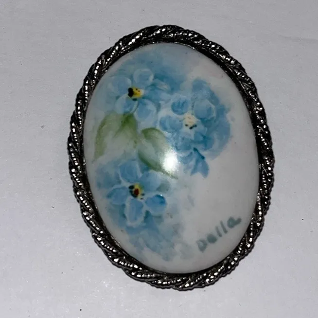 Vintage Hand Painted Violet Pastel Blue Forget Me Knots on Porcelain Pendant Pin Brooch I would dat... Show more