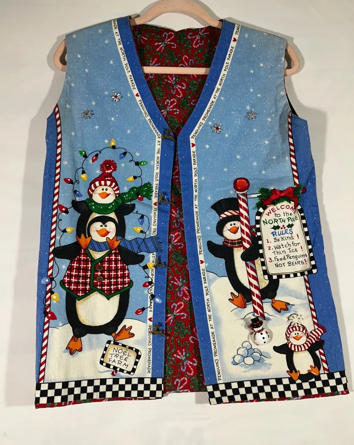 Embrace the joy of the season with this delightful quirky penguin Christmas vest. The vibrant front panel bursts with cheerful penguins, twinkling lights, and playful North Pole rules, while the reverse side offers a festive red candy cane and holly print for a completely different holiday vibe. Adorned with charming applique details and even tiny reindeer charms, this sleeveless vest adds a whimsical touch to any festive ensemble. Perfect for holiday parties ugly sweater contests or simply spreading cheer throughout the winter months. Measurements: • Chest: 21 in • Length: 27 in • Shoulder to Shoulder: 15 in Type: Vest Department: Unisex Adults Theme: Christmas Accents: Button,pins Features: Lined Fabric Type: Cotton Insulation Material: Polyester Season: Winter Occasion: Casual, Party/Cocktail Sleeve Length: Sleeveless Fit: Classic Keywords: holiday vest, christmas apparel, penguin print, winter fashion, festive wear, reversible clothing, novelty vest, ugly sweater party, quirky style, casual holiday, winter accessories, unique christmas, fun apparel, seasonal clothing