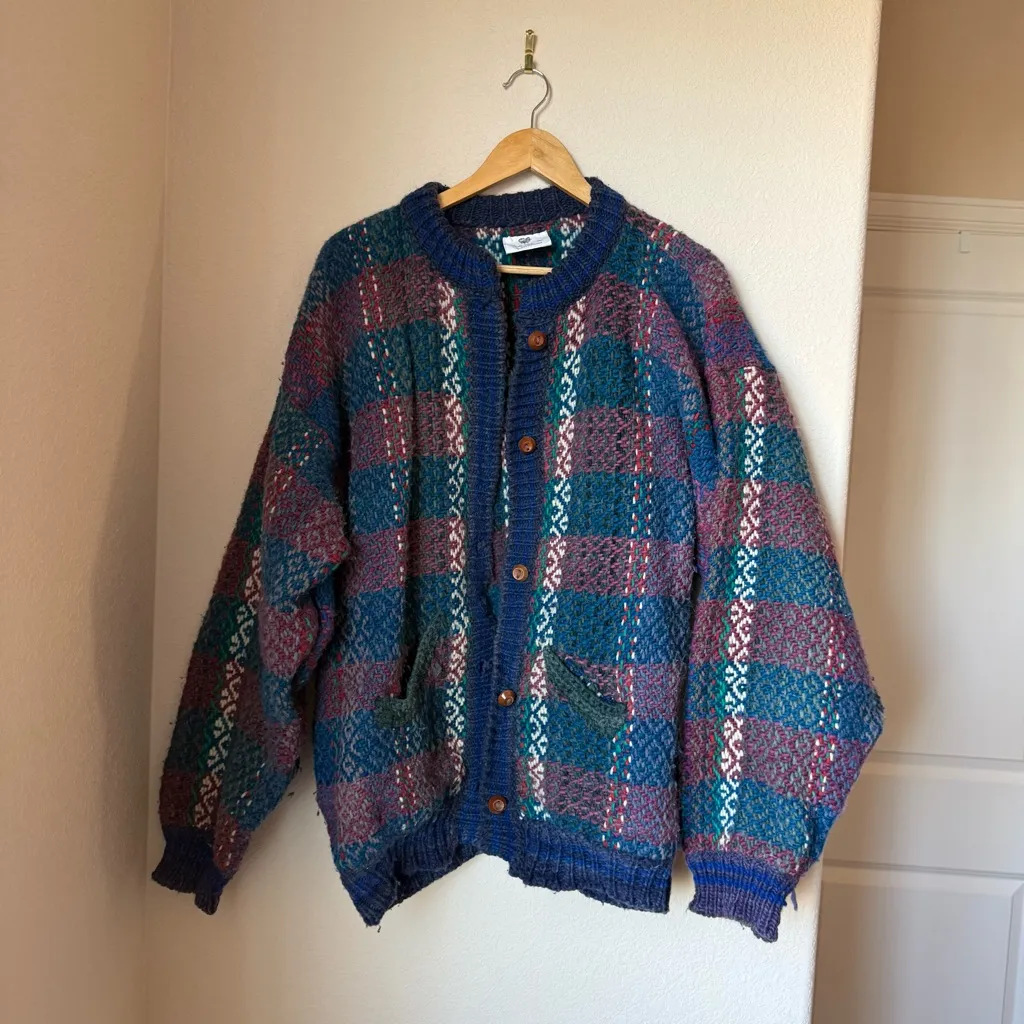 Brand: World Class, Inc. Material: 100% Wool Origin: Hand Made in Ecuador Fit: Fits like an XL / oversized (see measurements) Beautiful vintage handwoven wool cardigan featuring a rich, colorful geometric pattern in deep blues, teal, purple, and burgundy. This cozy statement sweater has a relaxed, slouchy fit with ribbed collar, cuffs, and hem, wooden button closure, and front patch pockets. Each piece is artisan-made, giving it a unique texture and authentic vintage character. Perfect as a chunky layering cardigan for fall and winter, worn oversized with denim or styled open over a tee. ✨ Details: • 100% wool • Handwoven / artisan made • Oversized, cozy fit • Wooden buttons • Front pockets • Vintage condition with natural texture variation consistent with handmade wool 📏 Fit Notes: Tagged size not listed; fits like an XL or intentionally oversized depending on desired look.