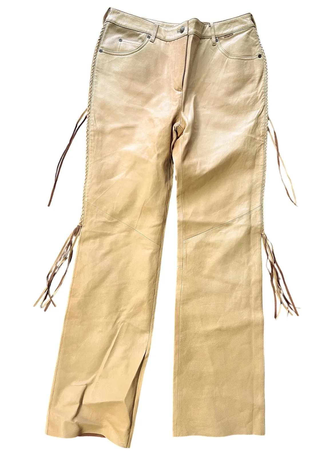 Very good condition. Minor markings, as shown. Size 40 / 12 Authentic vintage Harley-Davidson leather pants with classic moto styling and fringe detailing. Early 2000s era with genuine leather construction and signature branding throughout. Harley-Davidson black label Genuine leather Tan / beige color Fringe detailing along legs with braided accent Straight leg moto cut Button fly with belt loops Embroidered Harley-Davidson back pocket Lined Made in China Production date: 2003 Approximate flat measurements: Waist- 16.5" Rise- 10.5" Inseam- 33.5"