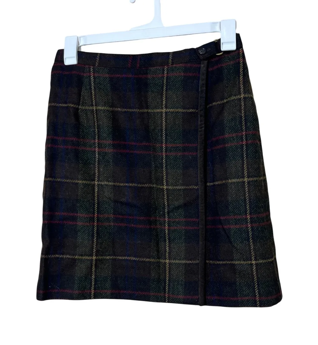 Elegant wool wrap skirt featuring a sophisticated plaid pattern in a blend of brown, green, red, and blue hues. This classic skirt boasts a flattering wrap design, complete with a secure button closure and a gold-tone accent. The skirt is fully lined, ensuring a comfortable fit and polished appearance. Its timeless design makes it a versatile addition to any wardrobe. Type: Skirt Style: Wrap Skirt Length: Knee Length Department: Women Pattern: Plaid Material: Wool Accents: Button Fabric Type: Tweed Features: Lined Theme: Preppy, 90s, Art Closure: Button Rise: Mid Keywords: vintage, retro, academia fashion, classic, plaid !!!Please See Measurements vintage sizes run smaller than modern sizes!!! Measurements Length: 20 inches Waist: 15 1/2 inches