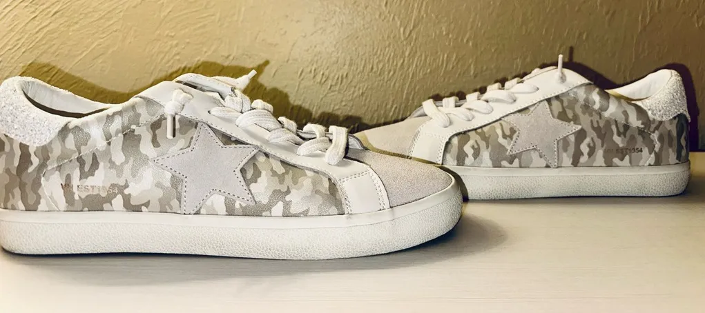 The Vintage Havana-Camo Print Star Sneakers are a stylish and trendy pair of athletic shoes designed for women. These low-top sneakers feature a lace-up closure and a gray and white camo color scheme with glitter accents and a star on the side. The suede and synthetic textile upper, along with a padded insole, ensure both comfort and durability. Perfect for adding a touch of flair to any outfit, these sneakers are a must-have for fashion-forward individuals looking to make a statement.