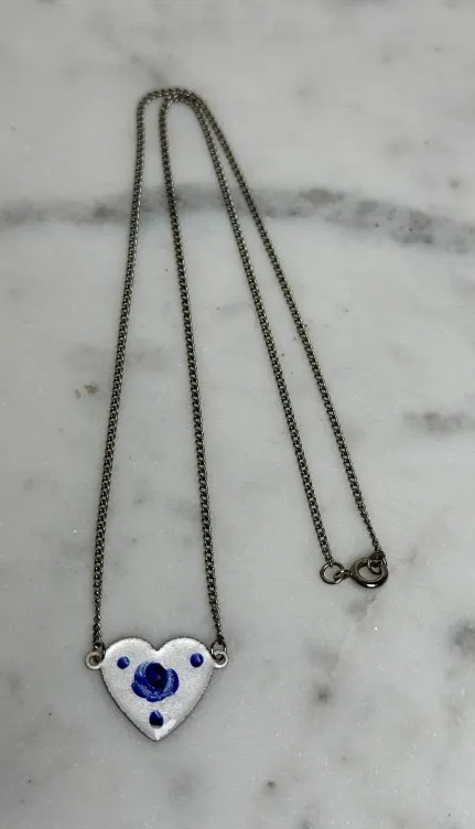 This vintage necklace features a delicate heart pendant embellished with blue stone accents, elegantly suspended on a silver chain. Its timeless design adds a touch of sophistication to any attire, making it an excellent choice for both casual and formal settings. • Heart-shaped pendant • Blue stone accents • Silver chain • Lobster clasp closure • Elegant design Minor surface wear on the back of the pendant.