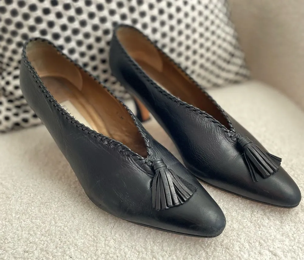 Vintage Evan Picone leather heels. The silhouette is high cut with whipstitch trim and tassels. The leather is soft and pliable, not stiff. Curved 1920s style heel that made a popular come back in the 80s. Heel is 3 inches tall. Leather uppers and leather soles that show some pitting consistent with light wear.