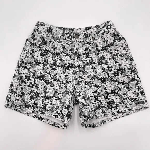 Vintage Lee floral denim shorts black and white daisy pattern all over. 5 pocket style, zipper fly. Condition: Gently preloved vintage with light fading, no holes or stains. Size: 6 Petite. See approximate measurements for best fit. Across waist: 14" Front rise: 11" Back rise: 15" Inseam: 4.5" Across leg opening: 12" Cleaned and from a smoke-free home. Fast shipper! Summer, retro, playful