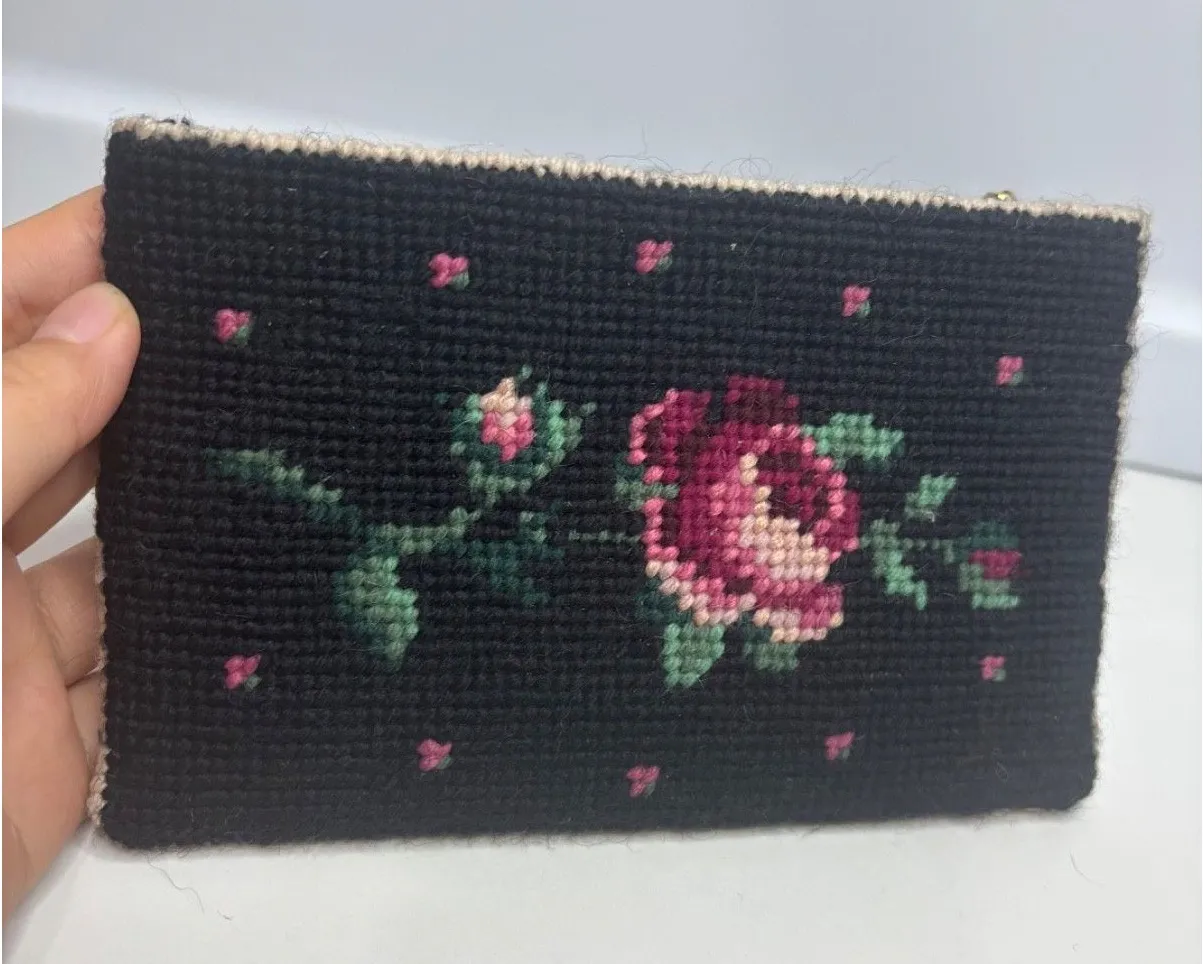Vintage hooked wool tapestry floral clutch handbag black rose bag - $25 - From huanjuan