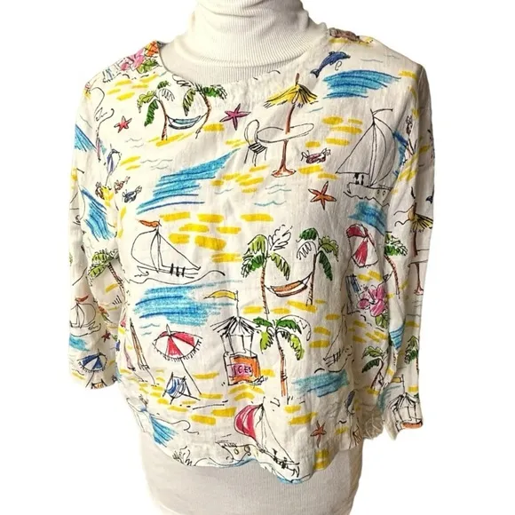 Vintage Hot Cotton Linen Beach Summer Dolphin Crab Boats Novelty Print Small White - $29 - From alicia
