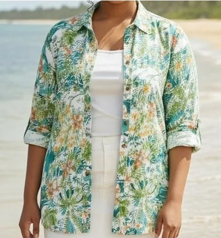 *Materials tag is missing, but the material tag on other listings of the exact same shirt say 100% linen. It looks and feels linen as well. Measurements: • Sleeve Length: 20.5 in • Pit to pit across chest: 24.5 in • Length (shoulder to hem): 28.5 in Type: Button-Up Department: Women Neckline: Collared Sleeve Length: 3/4 Sleeve Pattern: Floral Accents: Buttons Theme: Outdoor, Florida, California, Tropical, Hawaii Features: Lightweight, Breathable, Fit: Relaxed Fabric Type: Woven Occasion: Casual, Travel Closure: Button Season: Summer, Spring Keywords: tropical print, floral blouse, linen blend, button down shirt, resort wear, vacation shirt, beachwear, oversized, lightweight, summer top, cruise wear, island style, relaxed fit, 100% linen, resort ready, coastal, luau, vintage, 90s
