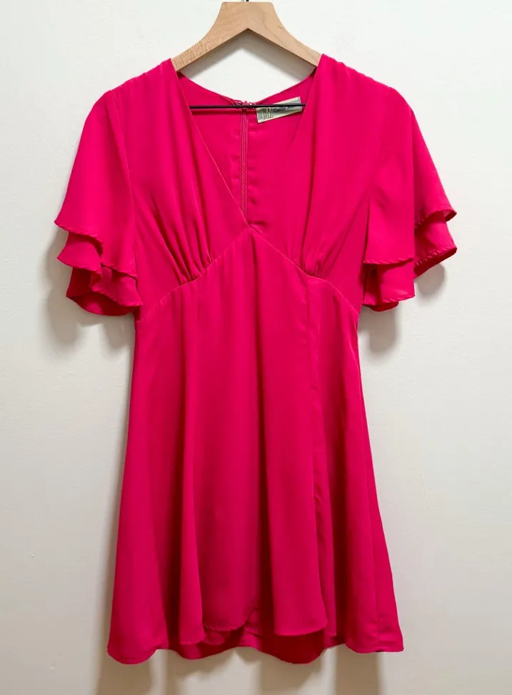Excellent vintage condition Hot pink mini dress Really pretty feminine flirty silhouette A-line V neck with ruffle sleeves and a flowy hem Brand: Callie Mac No size tag - measures and fits like a small Chest 32” Waist 28” Length 35” Tags: hot pink fuchsia barbiecore costume Halloween cute girly feminine coquette flirty vintage ruffle dress swing dress v neck Callie Mac a line