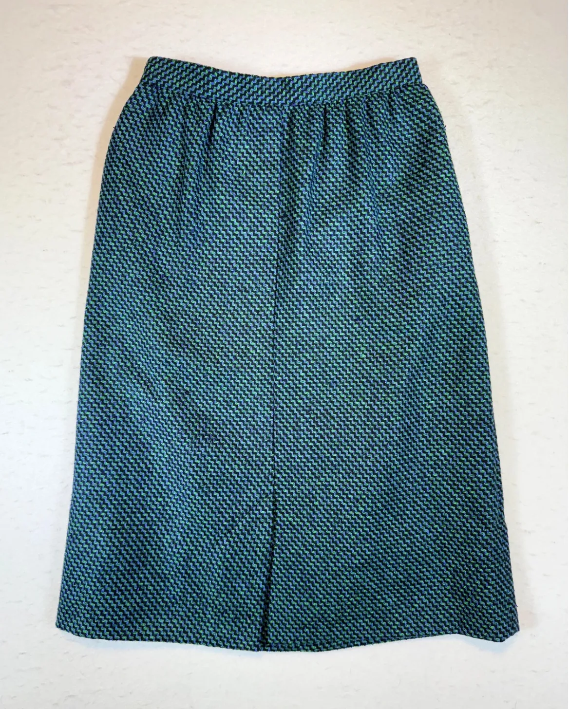 Howard Wolf knee-length pencil skirt in a striking blue and green geometric tweed pattern. This skir... Show more