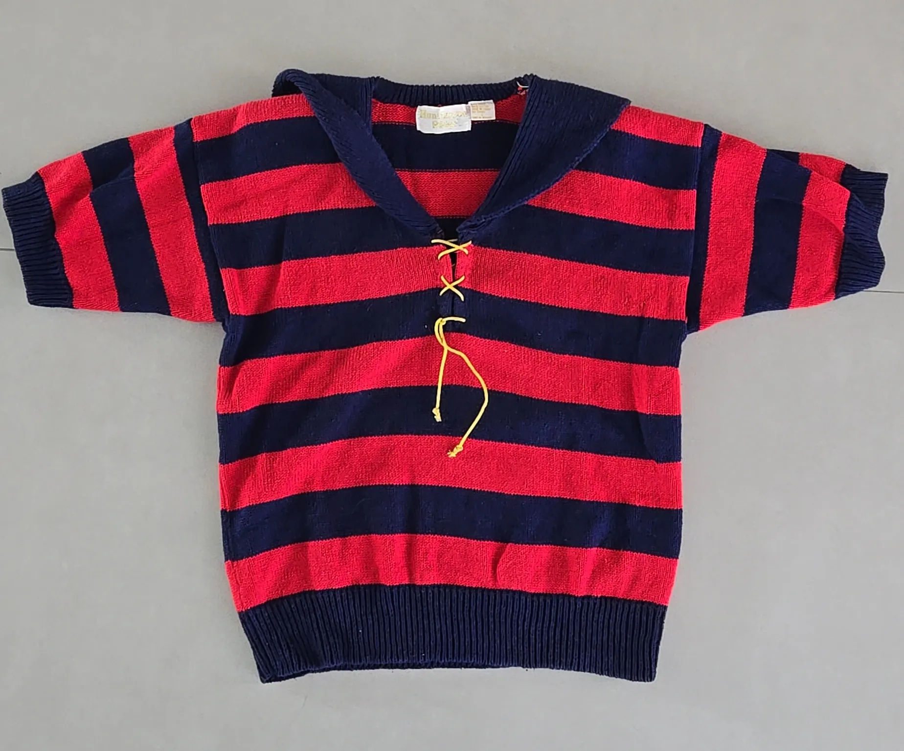 Stylish woman's vintage top featuring bold red and blue stripes, with attached back cape, shoulder p... Show more