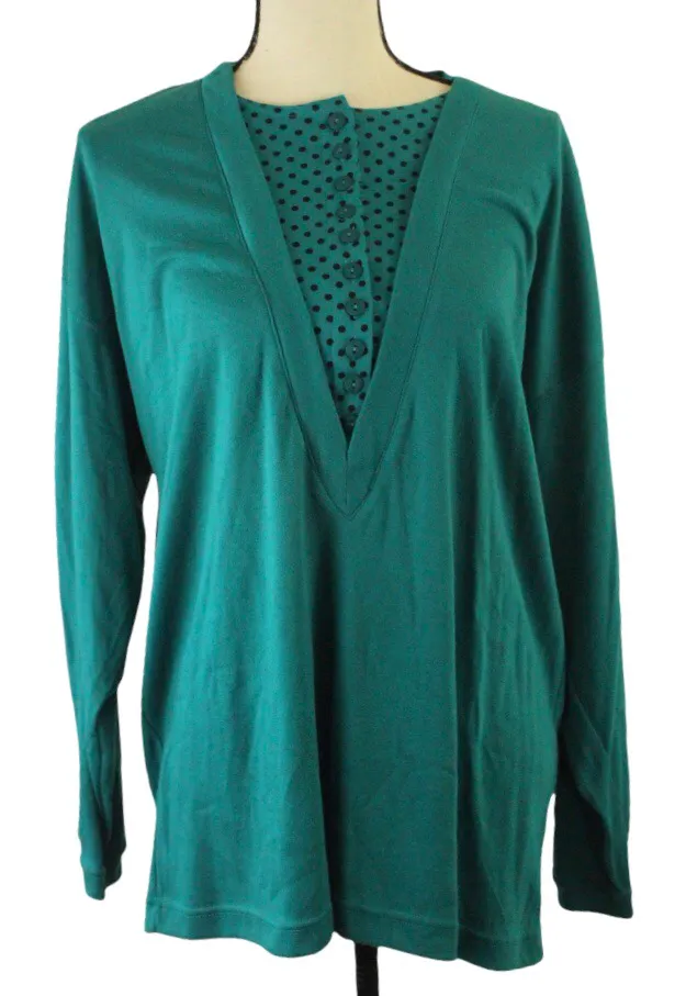 Vintage 80s International Sportswear deadstock plus size top. Long sleeve with faux polka dot undershirt. Green and black. Perfect condition. Size 18W. Measured lying flat- 24” armpit to armpit 23” at waist 20” sleeves 30” total length