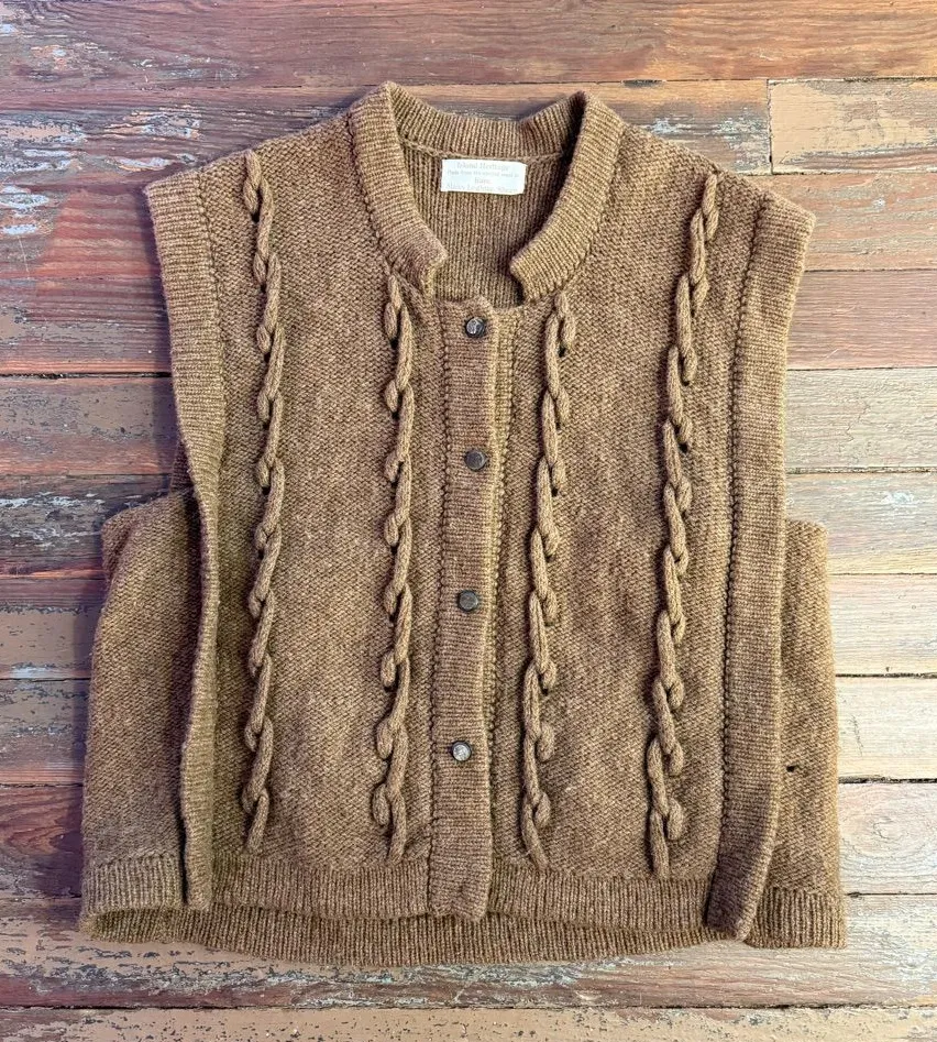 Elevate your cozy wardrobe with this rare vintage Island Heritage cardigan, crafted from 100% undyed sheep wool for that authentic, natural texture and warmth. The rich, earthy mocha brown hue (a super trendy neutral right now) comes straight from the sheep’s natural fleece—no dyes, just pure heritage craftsmanship. Featuring bold, chunky cable knit detailing down the front with intricate braided ropes, a classic collared neckline, button-front closure with rustic buttons, and a cozy, slightly cropped length that hits perfectly for modern styling. This cardigan is overall in great condition but does have one small hole, see picture. It doesn’t have a size tag but I’m estimating it to fit like a Large, please carefully check measurements before purchasing. Measurements are approximate and from laying flat: Chest: 21” Length: 24” Vintage ~ wool ~ winter ~ preppy vintage ~ academic ~ Ivy League ~ Wool ~ light academia ~ trendy ~ modern ~ bohemian ~ boho ~ bohemian style ~ earthy ~