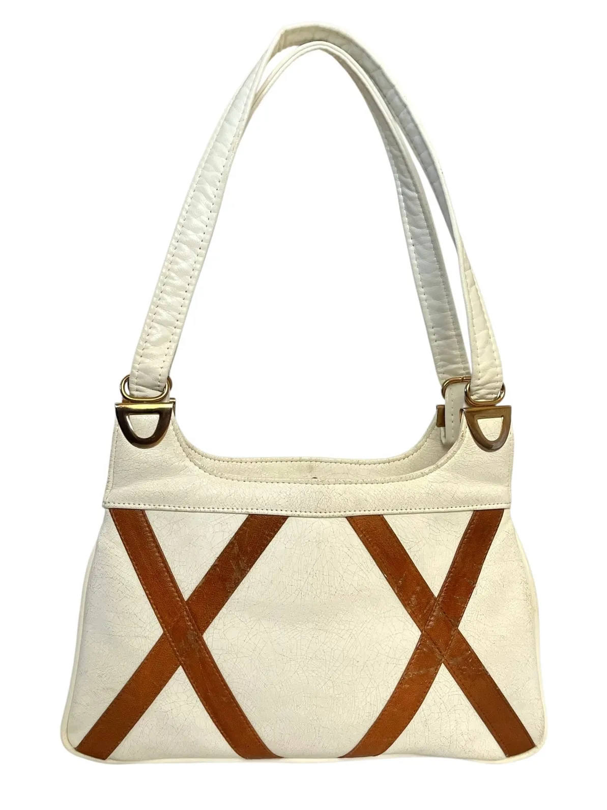 Midcentury triple-entry shoulder bag, circa 1960s. Off-white leather with distressed cracking details. Brown criss-cross accents forming two X's on front. Gold-tone hardware. Two open compartments with center hinged-frame compartment with kisslock closure. White vinyl lining with metal Falcon zipper pocket. Rear slip pocket. Dual shoulder straps. Good vintage condition. Leather recently cleaned and conditioned. Wear on front X's; mark inside zipper pocket. See all photos. 11.25" L x 9" H x 2" D Strap drop: 7"