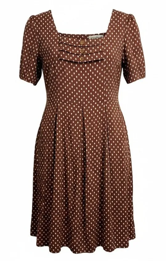 ✧ Brand: Jeffrey & Dara by Linda Hutley ✧ Size: Women's 10 (tagged Vintage 9, 90s sizing) ✧ Condition: Great vintage condition with no visible flaws or stains ✧ Material: 100% Rayon ✧ Color: Brown with Cream Polka Dots ✧ Style: Midi Length Dress ✧ Features: Square neckline with pleated bib and button detail Puff short sleeves with slight gathering Rear hidden zipper closure Full drape and soft swing hem Made in the USA vintage, cottagecore, polkadot, coquette, retro, feminine, 90s, romantic, softgirl, indie, madeinusa, warmtones ✰ Please review all photos for condition & measurements ✰ Measurements approx./in inches (measure your fave garment for best reference) ✰ Ships QUICK on same/next business day ✰ Items stored in sealed polybag/smoke & pet-free environment ✰ Colors may appear differently depending on your screen settings ✰ 1844