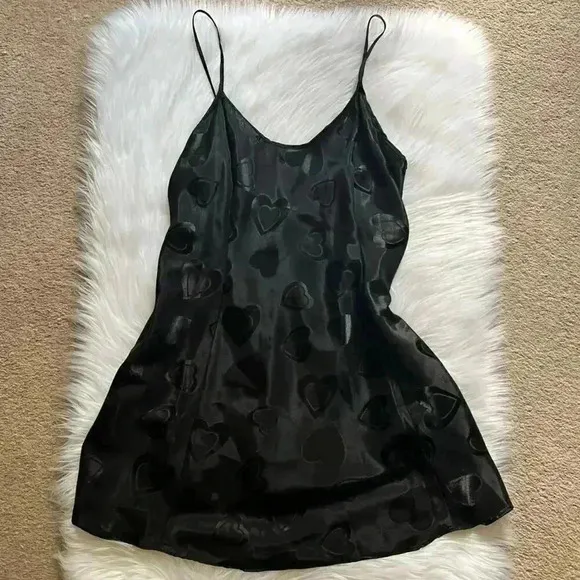 Vintage Jenny Buchanan Intimates Heart Print Satin Black Slip Dress Large Black satin with sublimated heart print. Not lined. No flaws. Front seams for a flattering curvy silhouette. Measurements flat Pit to pit 18.5” Bottom hem to top of shoulder 36”