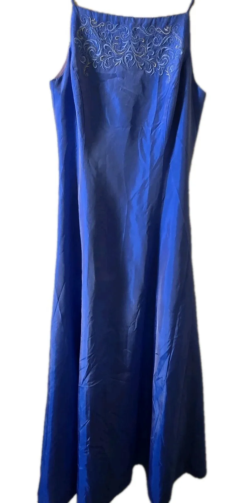 Good pre-owned condition! See pictures for a flaw on seam that may be fixable. Smoke free, cat friendly home - clothing not stored where she has access. Fast shipping 1-2 business days! Measurements (approx) Length 56" Sleeve from shoulder 10" Chest around 34" Keywords: blue dress, formal dress, evening gown, sleeveless dress, embroidered dress, party dress, special occasion dress, prom dress, wedding guest dress, maxi dress, aline dress, cocktail dress, vintage dress, classic dress
