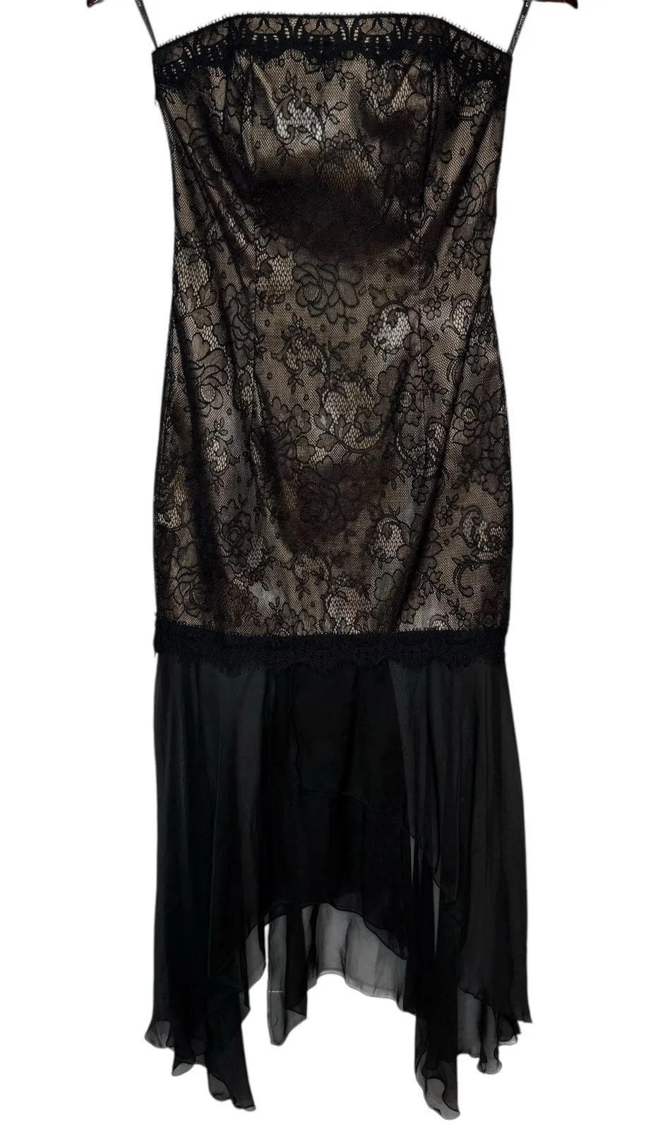 Vintage Jessica McClintock Lace Strapless Corset Dress Black size 4 Condition: Great! Please see last photo for pull in chiffon toward hem. No other blemishes to note. Vintage, 90s Lace and chiffon Black and beige Strapless Midi length Boning in the bodice Lined Hidden back zip closure Polyester, nylon, spandex Measurements: 15in underarm to underarm 13.5in across waist 17in across hips 46in total length Whimsygoth, steampunk, goth