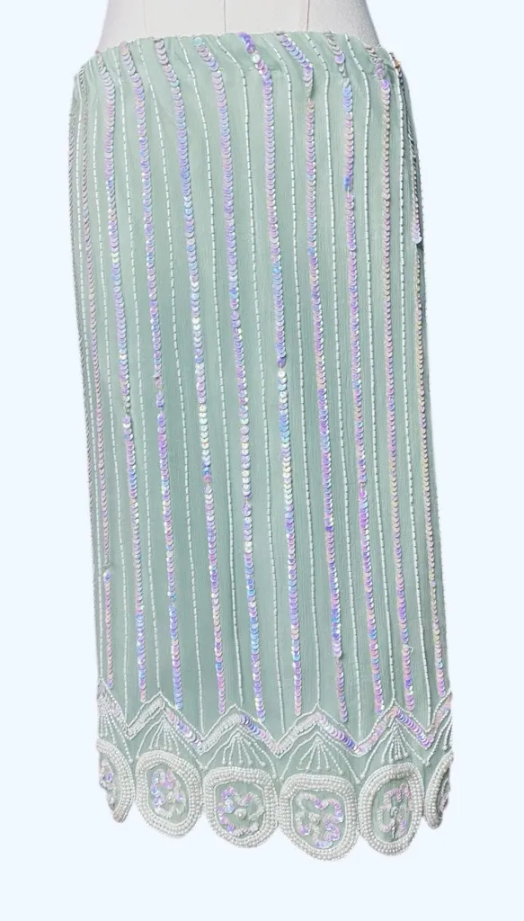 Stunning vintage skirt from Jewel Queen, perfect for a cocktail party, holiday event, or formal occasion! • Era/Style: Vintage, likely 1980s or 1990s (80s/90s Glam, Party, Great Gatsby, Art Deco inspired) • Color: Soft Sage Green / Mint Green with Iridescent Sequins and White Beading • Fabric: 100% Pure Silk Outer Shell, 100% Polyester lining (see tag photo) 100% Polyester Lining (see tag photo) • Details: • Fully adorned with vertical lines of iridescent sequins and small beads. • Gorgeous, intricate scalloped and embroidered beadwork along the hem. • Midi length (will vary based on height). • Pull-on style (likely elastic or a partially elastic waist, check for a zipper or elastic). • Made in India. • Size: Tagged Size 6 (Please check measurements before purchase! Vintage sizes can run small.) A true statement piece! Excellent vintage condition. •Measurements Length 24” waist with no stretching 14” Jewel Queen, Vintage Skirt, Silk Skirt, Beaded Skirt, Sequin Skirt, Midi Skirt, Cocktail, Party, Formal, Holiday, Christmas, New Year's Eve, Wedding Guest, Great Gatsby, Art Deco, 80s, 90s, Retro, Glam, Sparkle, Iridescent, Sage Green, Mint C-en, Made in India, Pure Silk, Size 6.