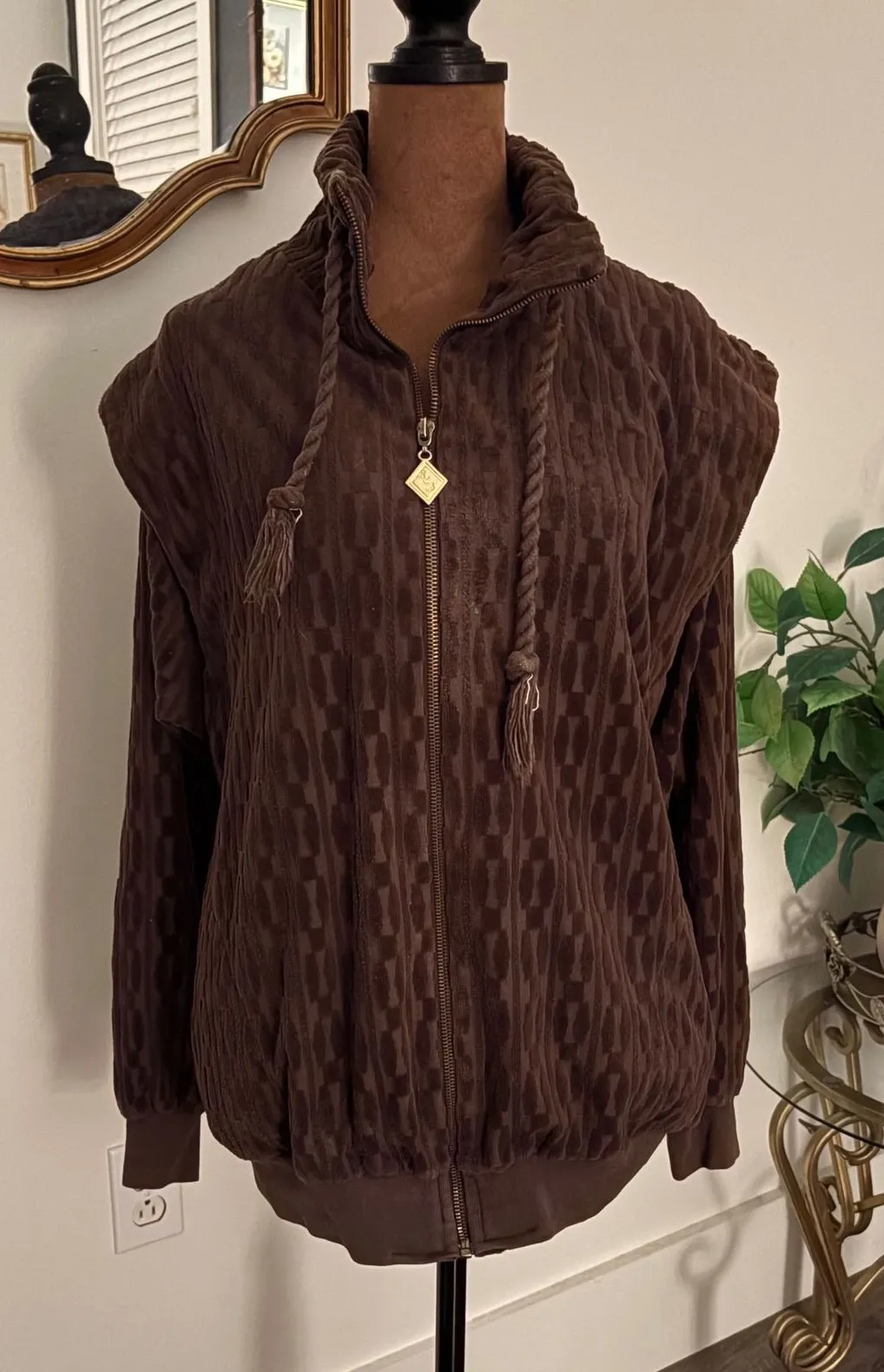 Elevate your wardrobe with this vintage Jez California jacket, a luxurious statement piece that exudes retro charm. The rich, chocolate brown velour fabric offers a plush and comforting feel, while the unique textured pattern adds visual depth and sophistication. Featuring a full zip closure with a distinctive pendant, a high collar, and stylish shoulder detailing, this jacket is a harmonious blend of comfort and fashion-forward design. The bomber silhouette and elasticized hem create a flattering and versatile fit. Perfect for layering during cooler evenings, casual outings, or adding a touch of vintage flair to a modern ensemble. See measurements for accuracy of size Measurements: • Pit to pit: 22 inches • Length: 23 inches • Bottom Hem: 19 inches • Sleeve length: 21 inches Qwom Type: Jacket Outer Shell Material: Velour Style: Bomber Jacket Department: Women Lining Material: Nylon Theme: Retro, Y2K, 80s, Vintage Fabric Type: Velour Features: Zipper, Pockets, Lightweight Accents: Zipper, Tasseled Pattern: Geometric Insulation Material: Synthetic Season: Fall, Spring Closure: Zip Keywords: vintage jacket, jez california, brown velour jacket, retro bomber jacket, zip up jacket, high collar jacket, shoulder detail jacket, womens jacket, casual jacket, velvet jacket, vintage bomber, brown jacket, velour bomber jacket, vintage clothing