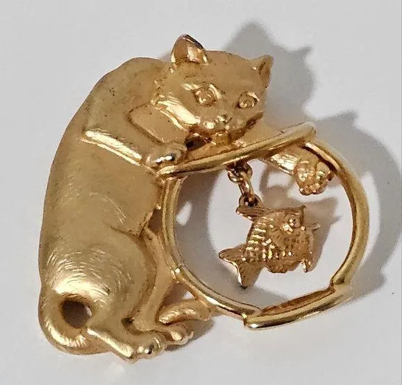 Vintage JJ Jonette 90s Goldtone Cat Playing In Fishbowl 2"x2" Brooch Gold - $38 - From Gina