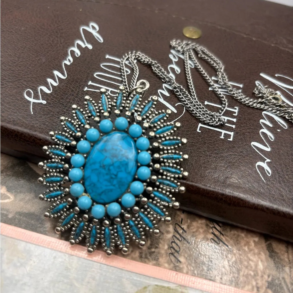 Vintage signed JJ (Jonette Jewelry Co.) necklace featuring a bold turquoise-style cabochon set in a silver-tone sunburst design. ✨ Pendant: 2” x 2” ✨ Chain length: 23” ✨ Signed “JJ” on back ✨ Era: 1970s–1980s Southwestern revival 🔹 About the Maker: Jonette Jewelry Company, founded in 1935, became known for whimsical and bold statement jewelry. The company closed in 2006, making their signed pieces highly collectible today. Perfect for collectors, boho styling, or Southwestern-inspired looks.