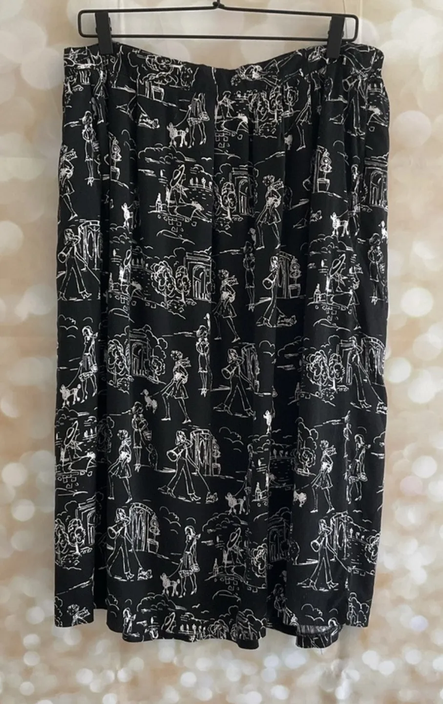 Vintage JMS Maxi Skirt Women walking dogs design Pre-owned light wash wear Black and white 100% rayon Machine washable Has pockets Elastic around waist Flat waist 16.75” Length 28” “O” Good