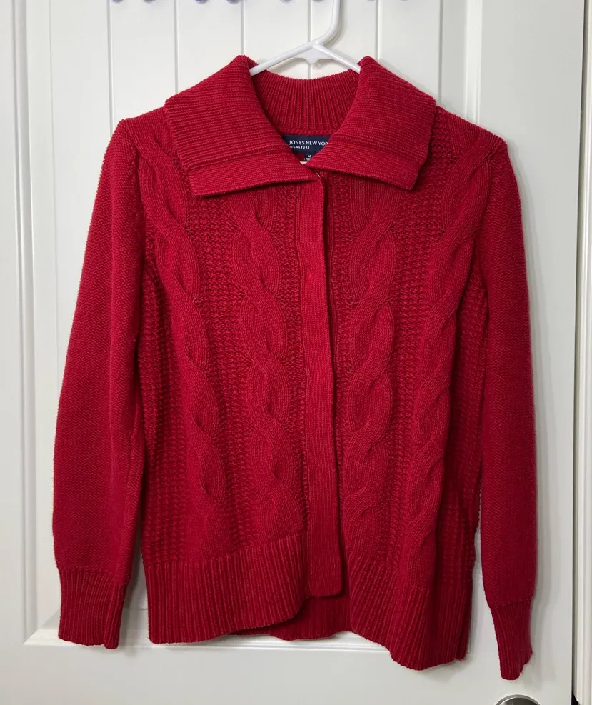 Vintage Jones New York Signature women’s red cable knit collar button sweater Size medium In good us... Show more