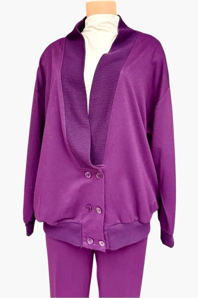 1980s vintage lounge set in a rich purple tone, reflecting the relaxed yet polished athleisure trend that defined the era. The oversized cardigan with deep ribbed shawl collar pairs effortlessly with the elastic-waist pants for an elevated casual look. Perfect for cozy layering, slow mornings, and casual going out. Brand: Joyce Sportswear Size: L–XL (see measurements) Measurements: • Cardigan: 27” length, 27” pit-to-pit • Pants: 42” length, 30” inseam, 14.5” rise, 16–20” waist (elastic) Material and Care: Knit blend; see tag for care instructions Condition: Very good vintage condition; light, consistent wear, clean and well-kept vintage lounge set, purple cardigan set, vintage athleisure, knit lounge wear, oversized cardigan, elastic waist pants, cozy vintage set, minimalist lounge