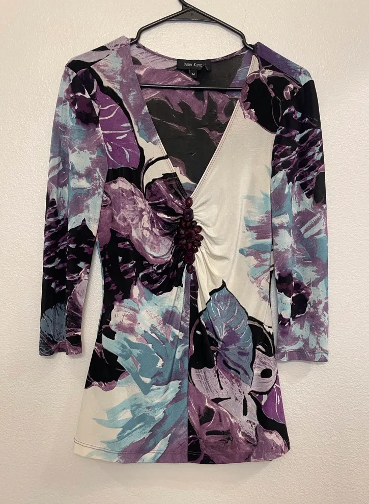 Vintage Karen Kane Women’s Y2K Purple White and Black Floral Print Top Size M. Great condition. Super cute stone detail in front. Elegant top with floral pattern. Features rich purple and black hues.