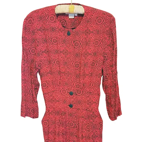 Vintage 1980s Karin Stevens midi dress in a bold red and black paisley floral pattern, size 10. This striking piece features a tailored silhouette with structured shoulders, three-quarter length sleeves, and a classic button-front design that reflects timeless 1980s elegance. **Please note: the modeled photo is for styling inspiration only; the actual dress does not include a belt or button placement—see photos for the true item details. • Brand: Karin Stevens • Pattern: Paisley floral • Length: Midi • Sleeves: Three-quarter length • Closure: Button front • Size: Women’s 10 vintage classic, 80s elegance, statement print, timeless, polished, retro chic, sophisticated