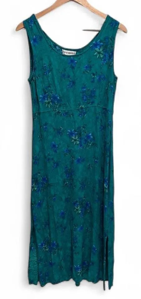 vintage karin stevens lightweight midi dress size 12 100% rayon. sleeveless, round neck. blue/green with floral pattern throughout. approx 18" pit2pit, 48" long tropical beach hawaii travel feminine